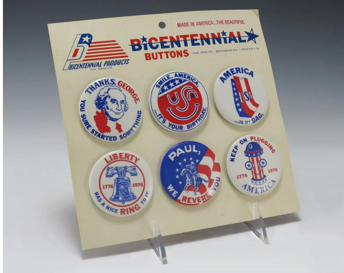 Six different Bicentennial buttons designed and sent by two art teachers to President Gerald R. Ford. Each button contains an individual design in red, white, and blue featuring various patriotic images and slogans. While not for sale to the general public, readers may recognize a few from Brooklyn ‘76.