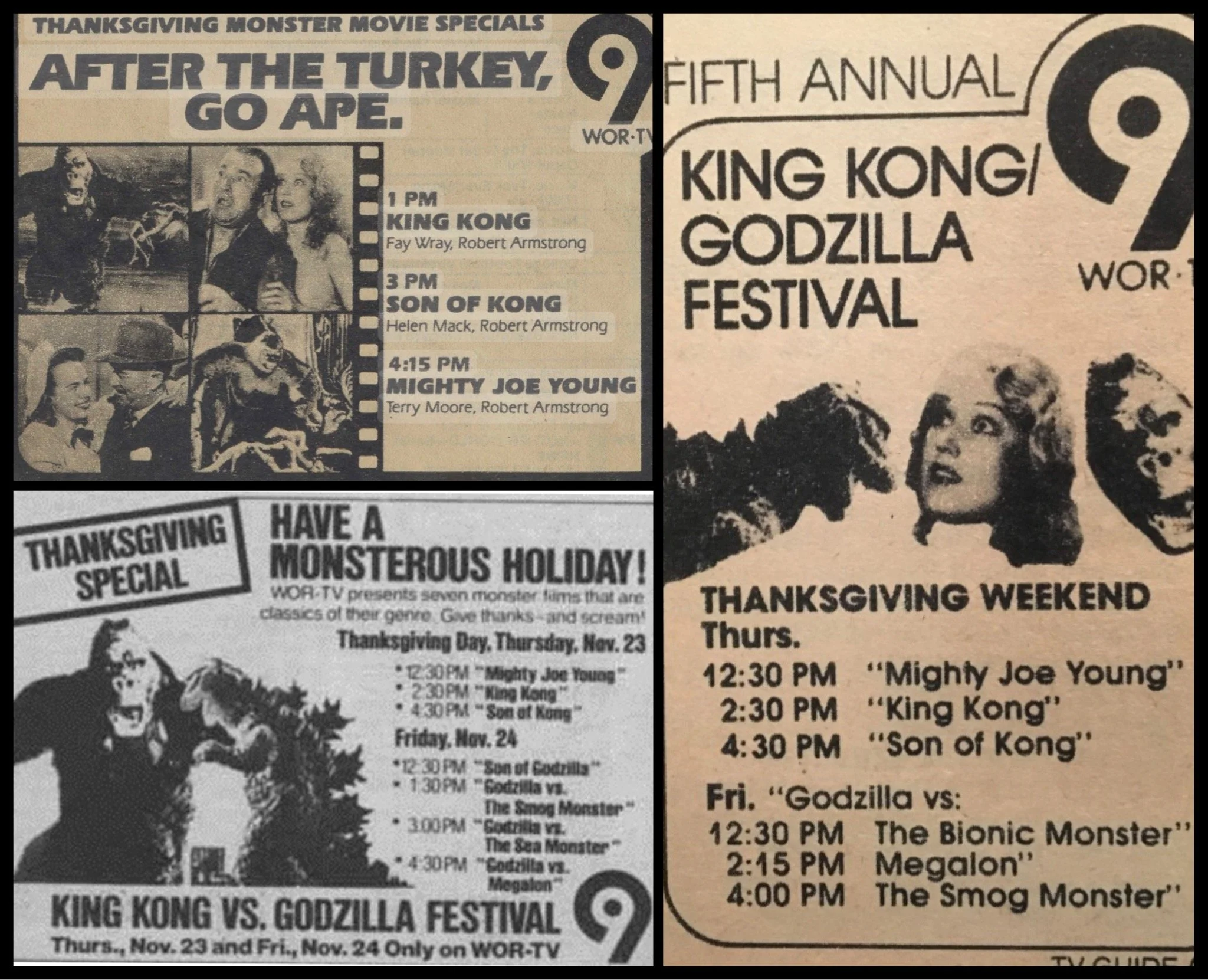 Two centuries of American exceptionalism culminated in this country’s greatest holiday film tradition, the WOR annual King Kong and Godzilla film festival. Movies only aired on Thanksgiving day 1976 with the broadcast of Mighty Joe Young (at 1 p.m.), King Kong vs. Godzilla (at 3 p.m.), and Son of Kong (at 5 p.m.). Black Friday films were added to the schedule in 1977.